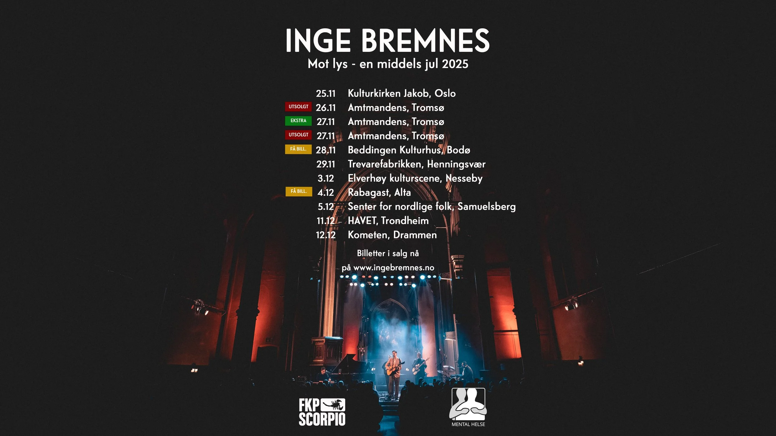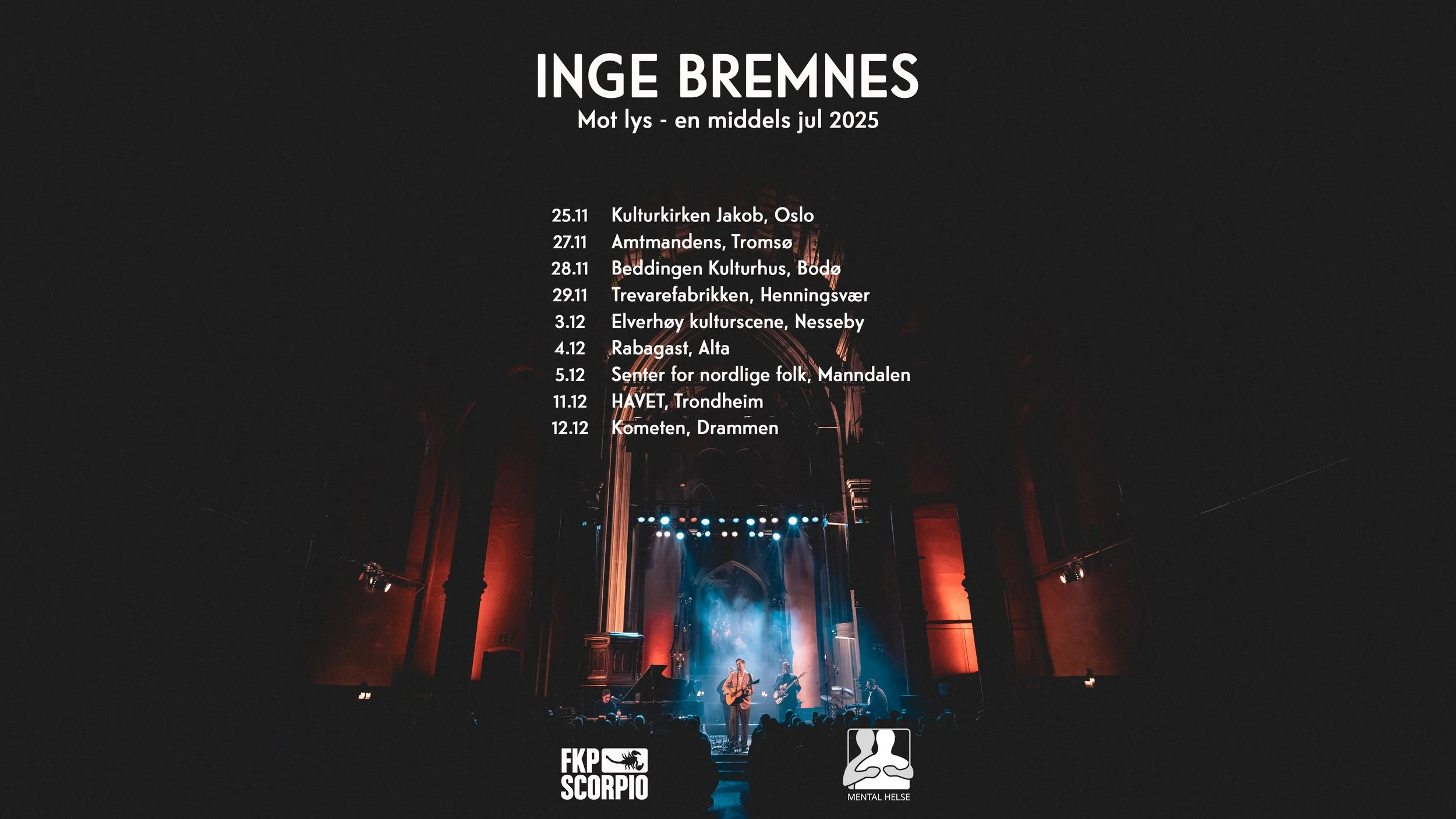 I tillegg til kjente Inge Bremnes-låter fra hele katalogen hans, blir det nye og gamle julelåter i ny drakt, humoristiske anekdoter fra artistens skråblikk på livet – og kanskje en liten påminnelse om at håpet alltid ligger der, selv i mørketida.